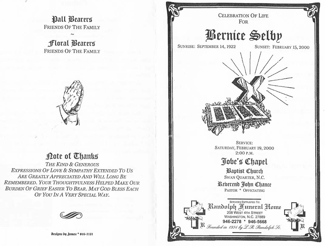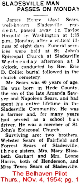 Mr. James Ernest Shelton, a resident of 22 Saint Lydia Road, Swan Quarter, died Friday, Sept. 23, 2011, at Pungo District Hospital, Belhaven. The family will receive friends at 29 Saint Lydia Road, Swan Quarter. Arrangements will be announced by Randolph Funeral Home, 219 N. Bonner St., Washington. (Washington Daily News - Saturday, September 24, 2011)