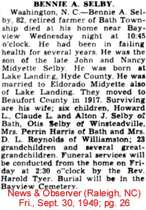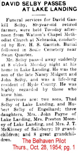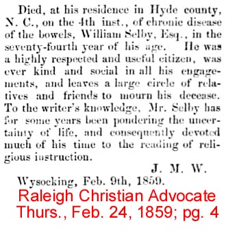 Died on the 13th inst. at Mattamuskeet, Hyde County, Mr. Samuel SELBY, at an advanced age. (American Recorder - Friday, August 24, 1821; pg. 3; column 2) [Posted here with kind permission from John H. Oden, III]