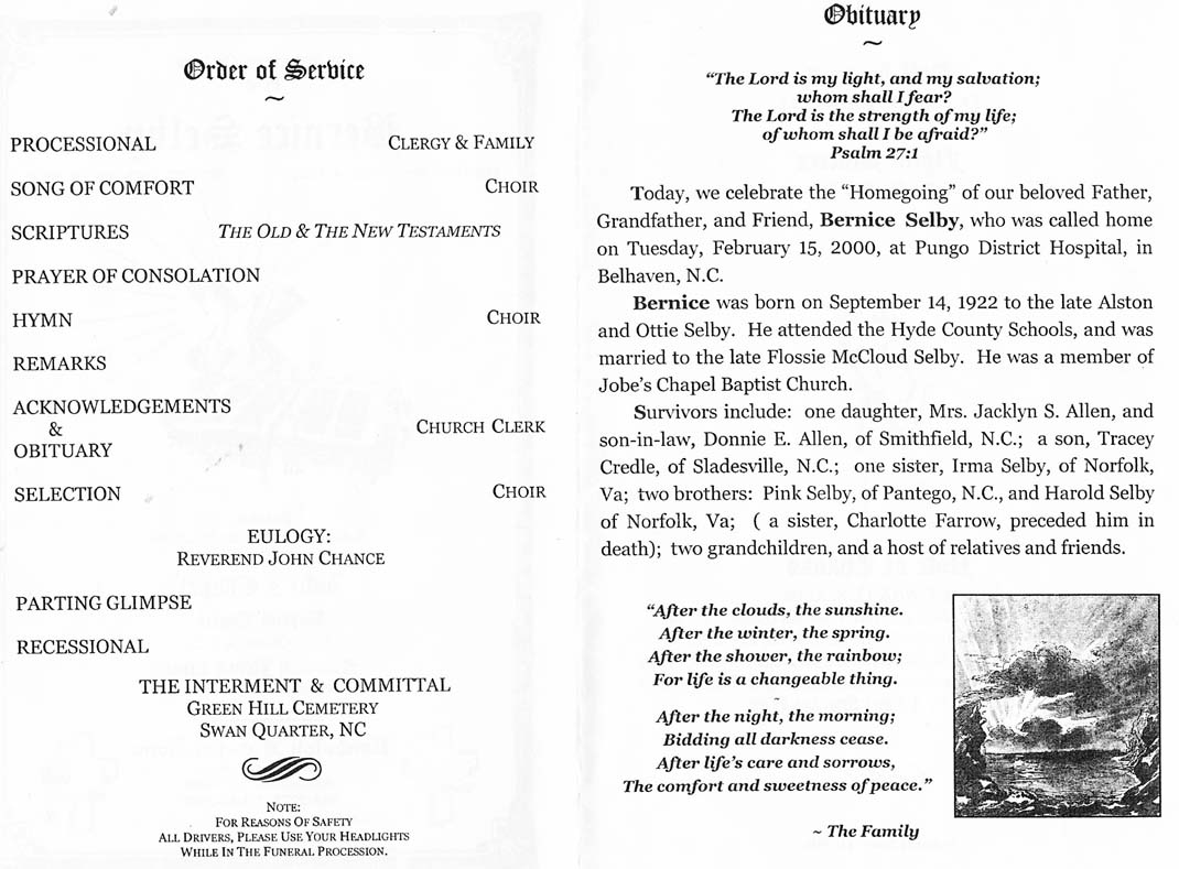 NORFOLK, VA. - Sammie Lee SELBY, 62, died on September 2. He was a native of Engelhard and was the son of the late Arthur and Mable Selby. He was a member of Phillippi Church of Christ Disciples. He was married to Barbara King. He was employed by Hebrew National in Maspath, N.Y. until his retirement in 1980. He was a graduate of Hyde County public schools and a believer in lifelong learning. Sammie studied biology and chemistry at Norfolk State University. Survivors include son, Sammie Tyrone Selby of Rio Rancho, N.M.; four daughters: Cheryl Selby and Lisa Patterson of North Plainfield, N.J., Angela Selby of Bronx, N.Y. and Brittany Selby of Norfolk; three brothers: Charlie Selby, David Selby and John Selby; three sisters: Lucinda S. Davenport, Rebecca S. Bryant and Flonia S. Davenport; 6 grandchildren; and a host of nieces, nephews and other relatives and friends. A memorial service was held Wednesday in Graves Funeral Chapel. Interment will be in Green Hill Cemetery in Engelhard. (The Coastland Times - Thursday, September 9, 1999; pg. 10A)