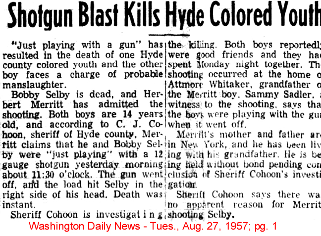 SWAN QUARTER - William R. SHELTON, 16, of Swan Quarter, died August 7 in a single-car accident on U.S. 264 in Hyde County. Young Shelton was a rising junior at Mattamuskeet High School. Funeral services will be held Wednesday at 2 p.m. at Mattamuskeet School Gymnasium. Burial will follow in Green Hill Cemetery in Swan Quarter. Whitfield and Whitley Funeral Home is in charge of arrangements. (The Coastland Times - Tuesday, August 11, 1992)