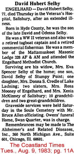Mr. Sherwood Jones Selby, age 78, a resident of 35363 U.S. Hwy. 264, Engelhard, NC died Tuesday, June 13, 2006 at Cross Creek. A funeral service will be held at 11 a.m. Friday, June 16, 2006 at the Engelhard Christian Church with Pastor Scott Sukeforth and the Reverend Charles Reber officiating. Burial will follow in the Selby-Spencer Cemetery. Randy Midgett, Danny Carowan, Brian Cuthrell, Wade Selby, Joe Pugh and Joseph Andrews will serve as pallbearers. Members of the Masonic Lodge will serve as honorary pallbearers. Mr. Selby was born in Hyde County on February 22, 1928, son of the late Dennis Lee Selby and Viola Mae Gibbs Selby. He attended East Hyde High School. On October 20, 1965, he married the former Lessie Veraldine Lanier, who survives. He was a commercial fisherman and owner of Selby’s Pool Room. Mr. Selby was a member of the Middletown Christian Church and later attended the Engelhard Christian Church. He served his country during the Korean War in the U.S. Army. He was a member of the VFW Post 9353, Masonic Lodge 294, American Legion Post 211 and Order of the Eastern Star, Hyde Chapter No. 213. In addition to his wife, Lessie of the home, he is survived by two daughters: Sherri Denise Selby and her friend, Bill McCue of the home and Viola Kaye Selby Williams and her husband, Odell Williams of Swan Quarter; her two children: Tyler and Mary Grace Williams and his sister: Camilla Burrus and her husband, R.B. “Bob” of Suffolk, Va. The family will receive friends from 6:30-8:30 Thursday at Engelhard Christian Church. Paul Funeral Home of Belhaven is serving the Selby Family. (Washington Daily News - Thursday, June 15, 2006)