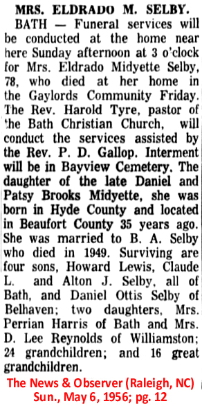 Mrs. Magieline T. SELBY, 74, of Swan Quarter, died Monday, Dec. 5, 2005, at Cross Creek Nursing Home. A funeral will be conducted at 1 p.m. Sunday in Saint Mary’s Church of Christ, Swan Quarter. Burial will follow in Green Hill Cemetery. Mrs. Selby was born in Hyde County. She was a member of Saint Mary’s Church of Christ, Swan Quarter. Survivors include one son, Maxwell Selby Jr. of Fairfield; six daughters, Maxine Shelton, Anita Selby and Rosie Selby, all of the home, Denise Blount and Christine Harris, both of Swan Quarter, and Bonnie Gibbs of Raleigh; three brothers, Robert Topping and Clifford Topping, both of Swan Quarter, and Marvin Topping of Bronx, N.Y.; two sisters, Cariner Gorham and Florence Cayruth, both of Washington; 19 grandchildren and eight great-grandchildren. The family will receive friends Saturday from 2-4 p.m. at Saint Mary’s Church of Christ, Swan Quarter. Arrangements are by Don Brown Funeral Home, Ayden. (Washington Daily News - Friday, December 9, 2005)
