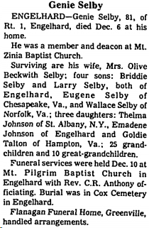Mrs. Olive Beckwith Selby, 97, a resident of Cross Creek Health Care Center and formerly of the Slocomb community of Engelhard, died Saturday, Aug. 2, 2008. A funeral will be conducted at noon Saturday in Mount Pilgrim Missionary Baptist Church with Elder Wallace Selby officiating. Burial will follow in Cox Cemetery. Mrs. Selby was born in Hyde County on April 21, 1911. She was the daughter of the late Dave and Katie W. Beckwith. She attended the Hyde County Schools. She was married to Genie Selby, who preceded her in death. She was a member of St. Percy Church of Christ (Disciples of Christ), where she served on the Mother board. Survivors include five sons, Briddie Selby and Larry Selby, both of Engelhard, Eugene Selby and Gregory Selby, both of Chesapeake, Va., and Wallace Selby of Norfolk, Va.; three daughters, Thelma Johnson of Queens, N.Y., Emma D. Johnson of Engelhard and Goldie S. Talton of Hampton, Va.; 25 grandchildren; 20 great-grandchildren; 20 great-great-grandchildren; six great-great-great-grandchildren and seven step-grandchildren. She was preceded in death by one daughter, Lydia and 10 siblings. The family will receive friends at the home of her daughter, Emma D. Johnson, 5245 Nebraska Road, Engelhard. A walk-in visitation will be held today from 1-7 p.m. at Whitfield & Whitley Funeral Home, Washington. (Washington Daily News [Washington, NC] – Friday, August 8, 2007)