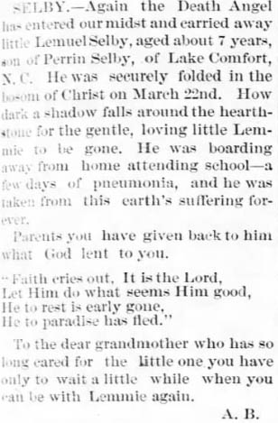 HYDE COUNTY - Miss Lilly SELBY, age 20, died Saturday of grippe. (The Economist Weekly (Elizabeth City) - Tuesday, March 29, 1892)