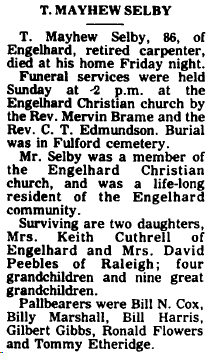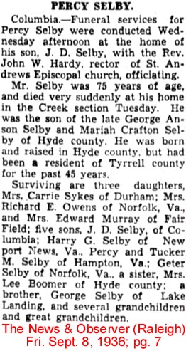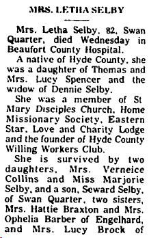 SWAN QUARTER - Maxwell SELBY, 82, of Route 1, Swan Quarter, died December 5 at Pungo District Hospital in Belhaven. Mr. Selby was born in Hyde County on March 4, 1915 to the late Burge Selby and Pinkie S. Spencer. He was a member of St. Mary's Church of Christ. He was married to the former Magieline Topping. In addition to his wife, survivors include six daughters: Maxine Shelton of Lancaster, Pa., and Denise Blount, Christine Harris, Bonnie Gibbs, Anita Selby and Rose M. Selby, all of Swan Quarter; one son, Maxwell Selby, Jr. of Williamston; two sisters: Rosa L. Gibbs of Engelhard and Monnie Adams of Norfolk, Va.; 14 grandchildren and 3 great-grand- children. Funeral services were held December 10 at St. Mary's Church of Christ in Swan Quarter with burial in Brooks Cemetery in Engelhard. Whitfield and Whitley Funeral Home was in charge. (The Coastland Times-Tuesday, December 16, 1997; pg. 11A)