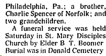 BELHAVEN - James Milton SADLER of Union St., Belhaven, died April 1 at Beaufort County Hospital in Washington. He was born at Lake Landing to the late Zachariah Spencer and Lillian Spencer. He served in the Army during World War II. He was married to Lydie Mae Hankins Sadler. Surviving are six daughters: Mary Mosely, Judy Mae Benjamin and Cheryll Ebron, all of Brooklyn, N.Y., Ella Mann of Belhaven, Hazel Basnight of Gum Neck and Teresa Salsbury of Baltimore; six sons: James Boomer of Pantego, William Sadler of Brooklyn, N. Y., Andrew Sadler of Wayne County, Oden Sadler of Baltimore, Herman Linton of Greenville and Sherman Linton of Acre Station; two sisters: Barbara Bonner of Queens, N.Y., and Glenda Lanier of Belhaven; two brothers: Zachariah Spencer, II of Grimesland and Artis Spencer of Pantego; 41 grandchildren and 10 great-grandchildren. Funeral services were held Tuesday at White Plains Free Will Baptist Church with the pastor, the Rev. Douglas Cogdell, officiating. Burial was in Northside Cemetery. Arrangements were by Randolph Funeral Home, 208 W. Fourth St., Washington. (The Coastland Times - April 9, 1992)