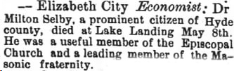 HYDE COUNTY - Mr. Henry SELBY, an old Confederate soldier, died the 11th inst. After a lingering illness of two years. (The Economist Weekly (Elizabeth City) - Tuesday, March 24, 1891)