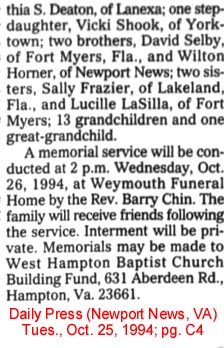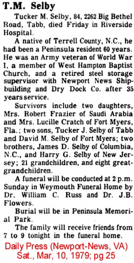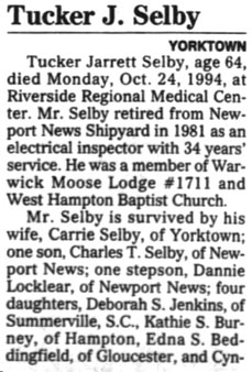 VIRGINIA BEACH, VA. - Milton Alfred SELBY, 92, of Auburn Drive, died in a local hospital Oct. 28. Mr. Selby was born on June 21, 1901, in Lake Landing. He was the son of the late Milton E. and Nancy Gibbs Selby. In his early years, he was a farmer and fisherman in Hyde County, and later a wheelsman for Little Creek to Cape Charles Ferry. He retired as a traffic controller at the Chesapeake Bay-Bridge Tunnel. He was married to Nancy Pearl Selby, Dec. 13, 1923. She preceded him in death. He was a member of Laurel Avenue Church of Christ. He is survived by one son and daughter-in-law, Chester and Betty Selby; two grandsons, four great-grandchildren, all of Gage, Okla.; two nieces and two nephews. The funeral services were set for 11 a.m. Saturday, Oct. 30, in Smith and Williams Funeral Home, Kempsville Chapel, Virginia Beach, by the Rev. Rupert R. Wallace with burial to follow in Rosewood Memorial Park. (The Coastland Times-October 1993)