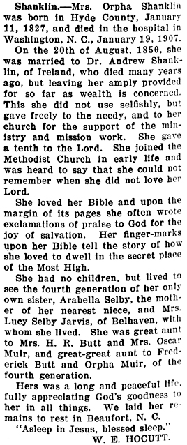 Died on Saturday the 12th inst. at Mattamuskeet, Hyde County, Mrs. Mahetable Ann SHELDON, consort of Israel Sheldon, Esq., Clerk of the Superior Court of that County. (American Recorder - Friday, July 25, 1823; pg. 3; column 2) [Posted here with kind permission from John H. Oden, III]