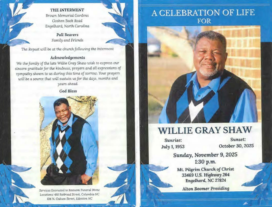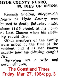 FAIRFIELD - James Luke SHAW, JR., 48, died Tuesday, November 10, at Pungo District Hospital in Belhaven. A native of Hyde County, he was the son of Rosetta G. and James L. Shaw, Sr. of Norfolk, Va. He is survived by three brothers: Milton Shaw of Georgia, Lawrence Shaw of Kinston, and Bobby C. Shaw of Manteo; and three sisters: Ernestine Selby of Norfolk, Eunice Russell of Currituck, and Jeanette Spencer of Norfolk. Funeral services will be held today (Sunday) at 2 p.m. at Mt. Pilgrim Church of Christ with the Rev. Phil Emmert officiating. Burial will be in Brown Memorial Cemetery in Engelhard. Rowsom Funeral Home in Columbia is in charge of arrangements. (The Coastland Times - Sunday, November 15, 1998; pg. 10A)