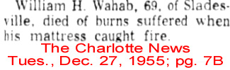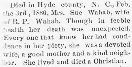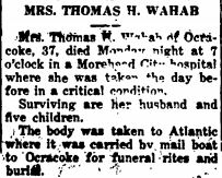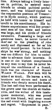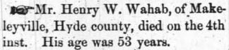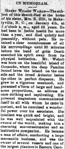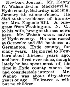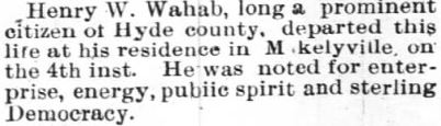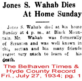 SWAN QUARTER - Funeral services for Charles Edmondson WAHAB, a well-known and highly respected resident of Hyde County, who died January 6th in a Concord nursing home, were held at Calvary Episcopal Church in Swan Quarter Saturday. He was born September 28, 1877, son of the late James Howard Wahab and Emma Smith Wahab, and was a life-long resident of Hyde County. Rev. J.N. Bynum of Battleboro officiated. Burial was in the family cemetery in Currituck. Surviving are four daughters: Mrs. D.D. Topping of Pantego, Mrs. Thomas W. Cahoon of Swan Quarter, Mrs. James W. Barkley of Rocky Mounty and Mrs. Robert E. Tunnell of Greenville; three sons: Job H. Wahab and Charles E. Jr. of Warsaw, N.C. and Captain Thomas W. Wahab of the USAF, presently stationed at Columbus, Ohio; two sisters: Mrs. Carl Wilson of Belhaven and Mrs. Herbert Rittenhouse of New Haven, Conn.; two brothers: H.W. Wahab of Belhaven and W.W. Wahab of Scranton; and several grandchildren. (The Coastland Times - Friday, January 8, 1954; pg. 4)