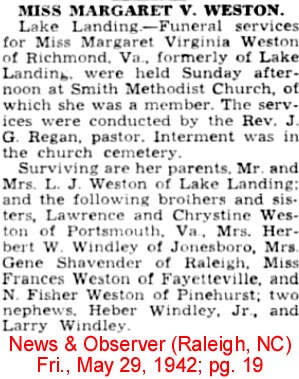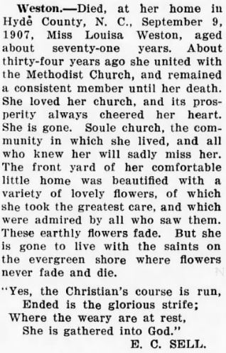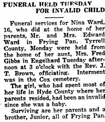 Washington, N.C. - Mrs. Nora Warner, 58, died in a Raleigh hospital on Monday morning following an illness of several years. She was a native of Hyde County and lived in the Sladesville Community. Surviving are three sons, two daughters, and several grandchildren. Funeral services were held from the Beulah Primitive Baptist Church of Sladesville on Tuesday afternoon at 4:30 o’clock conducted by the Rev. Mr. Ross, pastor of the church. Burial followed in the church cemetery. (The News & Observer - Friday, Aug. 27, 1948)