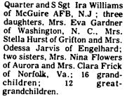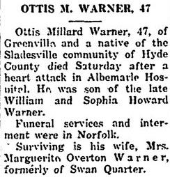 NORFOLK — Ottis Millard Warner, 46, of 8617 Tidewater Drive died Saturday at 5 p.m. in an Elizabeth City, N.C., hospital. A native of Scranton, N.C., he was a son of William and Mrs. Sophie Howard Warner and the husband of Mrs. Marguerite Overton Warner. He was a member of Assembly of God Church, Greenville, N.C., and an Army veteran of World War II. He was a member of Earlewood Masonic Lodge Chapter and Commandery of Columbia, S.C. His wife is his only immediate survivor. A funeral service will be held in Hollomon-Brown Funeral Home Monday at 3 p.m. by the Rev. David A. Berquist. Burial will be in Forest Lawn Cemetery. (The Virginian-Pilot, Norfolk, VA- Sunday, Jan. 26, 1969, Pg. B4)