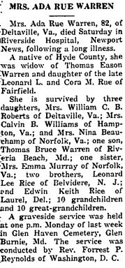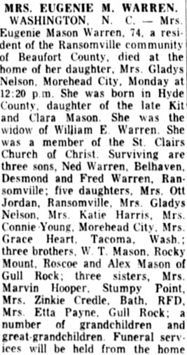 GULROCK - Mrs. Eugenia Mason WARREN, age 74, resident of Ransomville and native of Gulrock, Hyde County, died at the home of her daughter, Mrs. Gladys Nelson, in Morehead City Monday afternoon at 12:20 o'clock following a critical illness of several days. She had been in failing health for the past year. Mrs. Warren was the daughter of the late Kit and Clara Mason, of Mount Pleasant. She was the widow of William E. Warren who preceded her in death in 1944. She was a member of the St. Clair's Church of Christ. Surviving are three sons: Ned Warren of Belhaven, Desmond Warren and Fred Warren of Ransomville; five daughters: Mrs. Ott Jordan of Ransomville, Mrs. Gladys Nelson, Mrs. Katie Harris, Mrs. Connie Young (all of Morehead City), and Mrs. Grace Heart of Tacoma, Wash.; three brothers: William T. Mason of Rocky Mount and Roscoe and Alex Mason of Gulrock; three sisters: Mrs. Marvin Hooper of Stumpy Point, Mrs. Zinkie Credle of Bath and Mrs. Etta Payne of Gulrock, and a number of grandchildren and great-grandchildren. Funeral services were held from the home near Ransomville Tuesday afternoon at 2:00 o'clock with the Rev. Walton Hudnell officiating. Burial was in the family cemetery near the home. (The Coastland Times - Thursday, November 12, 1953) [Submitted from the Alton Warren Payne Collection]