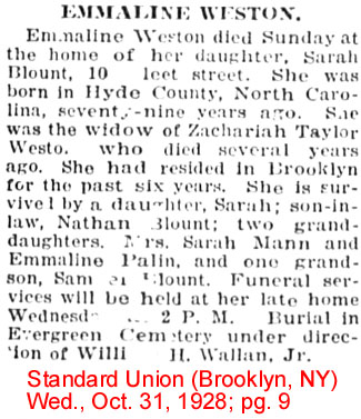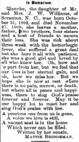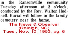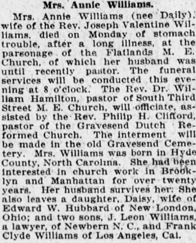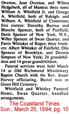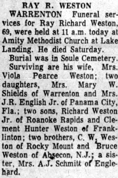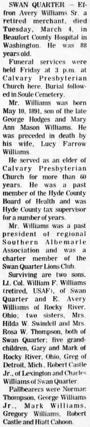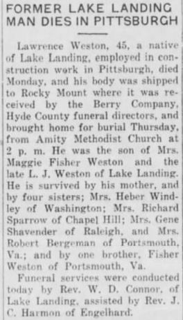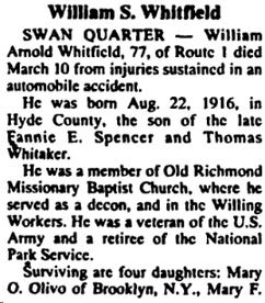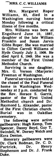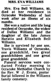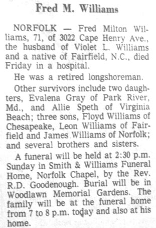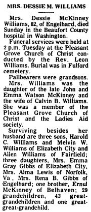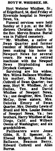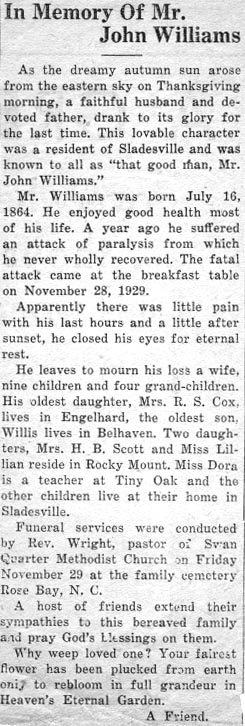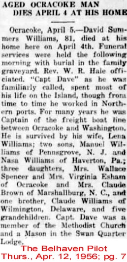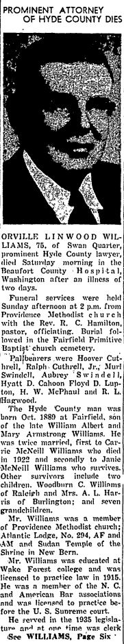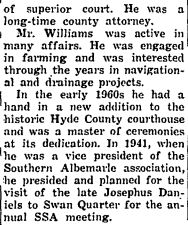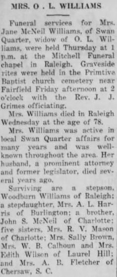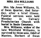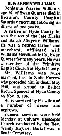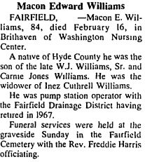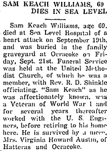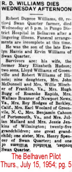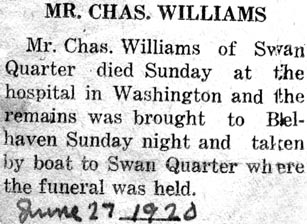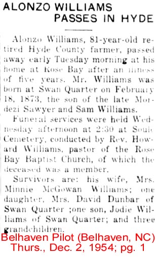 Willis Williams, 54, died at Duke Hospital Monday and was buried Tuesday in the Belhaven Community Cemetery following services at the Paul Funeral Home, conducted by Rev. David G. Brown, Jr. of Plymouth. He resided in Belhaven where for many years he had been employed by the Belhaven Fish and Oyster Co. He was the husband of Mrs. Nora Daniels Williams. He was a native of Hyde County, the son of Nancy Jean and John W. Williams. He is survived by one son, Willis Williams; one daughter, Mrs. W.T. McDaniels of Childersburg, Ala.; four grandchildren; two brothers: John of Warwick, Va. and Sidney of San Diego, Calif.; four sisters: Mrs. R.S. Cox of Engelhard, Mrs. J.M. Fox and Mrs. H.B. Scott of Rocky Mount, and Mrs. Harvey Jordan of Belhaven. (The Coastland Times - Friday, July 24, 1959; pg. 7)