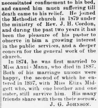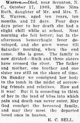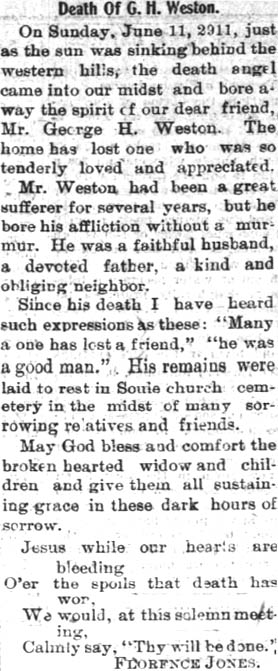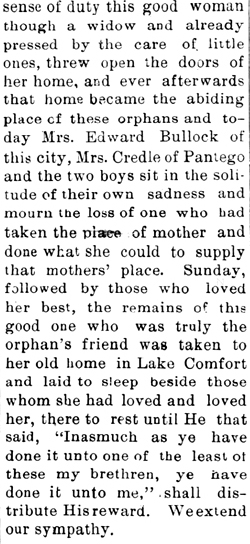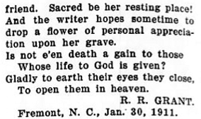 "She knew in whom she believed and was persuaded that He was able to keep her against that day." The testimony of all who knew her confirm the belief that she lived a true Christian life and died a triumphant death in the faith of her Lord. Truly, it may be said of her, "She wrought well and died in the hope of a blissful immortality." At the grave our loss was mourned by a host of relatives and friends. After a few words of comfort to the bereaved and mourning ones by our beloved Brother, James Potter, we gently laid her in the little grave, there to await the resurrection, when God will call her forth, clothed in that queenly robe and in that triumphant state, to sing praises around His great white throne forever and forever. To all who ministered to her comfort, loaned a helping hand, or inquired for her welfare during her sickness, death and burial, the relatives wish to extend their sincere thanks and appreciation. May the Lord direct us in the right way and enable us to walk therein. May He enable us to put our trust in Him and submit to His will and carry us safely home with our loved ones and all the redeemed.