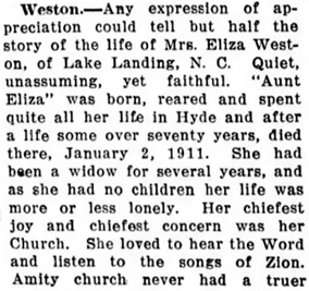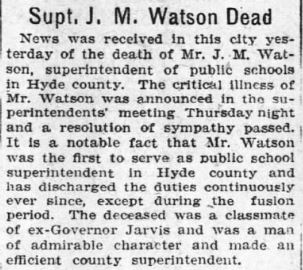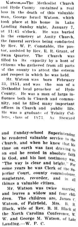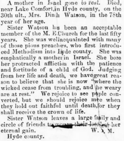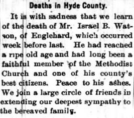 HYDE COUNTY NEWS - During the past week Lake Landing has lost one of its oldest citizens in the death of Mrs. Caroline WATSON. Mrs. Watson was visiting her relatives in New Holland when she suddenly passed away. She had lived with Mr. Collin BARBER for a number of years and is better known as the sister of the second wife of the late Rev. S.S. Barber who spent most of his life in the county. The interment was at the M.E. Cemetery of Amity Church and the Rev. J.J. Lewis read the service. (The Independent [Elizabeth City, N.C.] - Friday, November 30, 1923; pg. 6B)