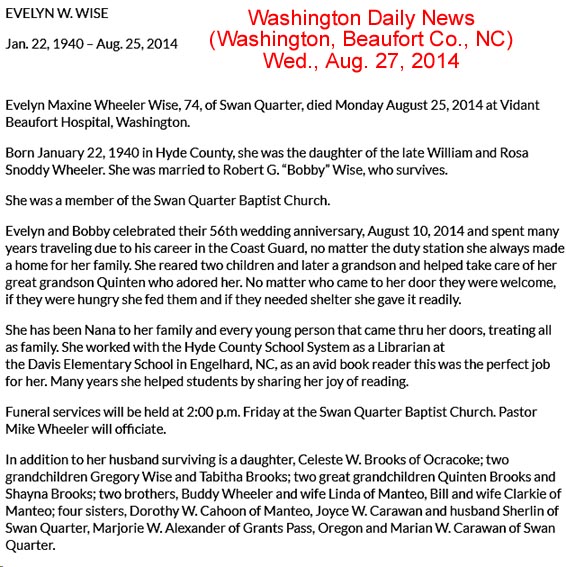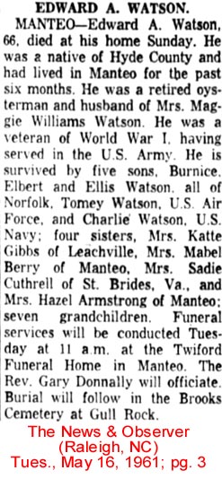 STUMPY POINT - Funeral services for Thomas M. WISE, 75 year old Stumpy Point resident, were conducted Sunday afternoon from the Stumpy Point Methodist Church by Rev. A.L.G. Stephenson. Graveside rites were conducted by the Mattakuskeet Masonic Lodge of Engelhard of which he was a member. Mr. Wise, who served in the Infantry in WW I, passed away at the veterans Hospital in Kecoughtan, Va. early Saturday after a confinement of several months. He was a fisherman most of his life, but for the past 15 years he ad been employed at the Norfolk Naval Base. He is survived by his wife, Mrs. Gertrude Wise of Stumpy Point; one sister, Mrs. Melton Hooper of Stumpy Point; three brothers: W.G. Wise of Stumpy Point, John M. Wise of New Bern and Will Wise of Norfolk, Va. (The Coastland Times - Friday, April 30, 1954; pg. 10)