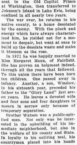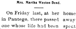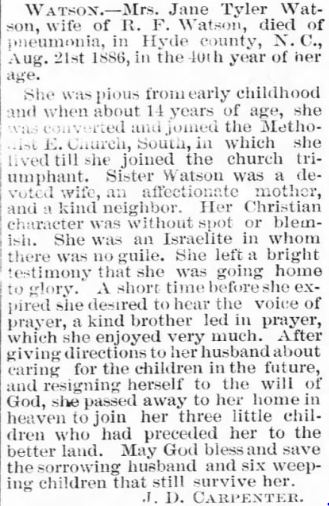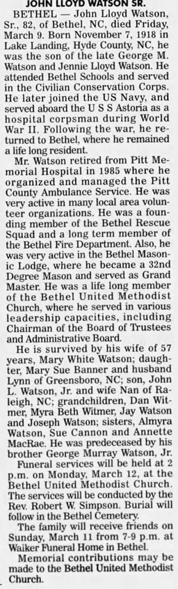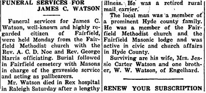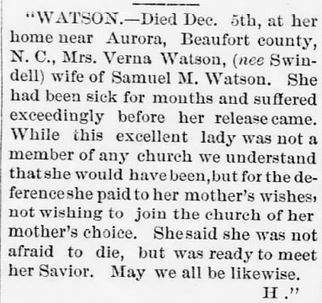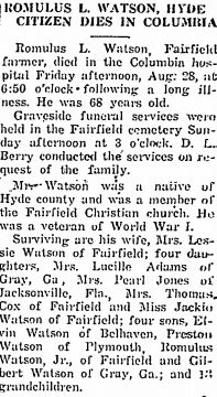 AURORA - Mrs. Eva Delle WATSON, 54, died at her home near Aurora, Thursday morning after an extended illness. Mrs. Watson was a native of Swan Quarter and after her marriage, she came to the Aurora community where she has since made her home. She was the daughter of Mrs. Mollie Benson and the late T.R. Benson of Swan Quarter. She was a member of the Aurora Methodist Church. Mrs. Watson is survived by her husband [Leslie Alston Watson]; [four sons?] Leslie A. Watson, Jr. of Wake Forest, S.B. Watson of Greensboro, Frank M. Watson of Nashville, Walter A. Watson of Aurora; three daughters, Mrs. S.S. Henry, Mrs. S.R. Peterson, both of Greensboro, and Mrs. Mark Cuthrell of Aurora; three sisters: Mrs. H.C. Boomer, Mrs. W.C. Boomer and Miss Hattie Benson, all of Swan Quarter; and 3 grandchildren. Funeral services were held at the Methodist Church at 3 o'clock Friday afternoon and were conducted by her pastor, the Rev. G.S. Eubank, with burial in the Aurora Cemetery. The pallbearers were D.M. Windley, Jr., C.A. Litchfield, G.W. Litchfield, Jack McWilliams, Carl Watson and Willie Selby. (Washington Daily News - April 1940) [Submitted by Merlin S. Berry of Gambrills, Md. who states Eva Delle Benson Watson was born Feb. 4, 1886 and died April 4, 1940.]
