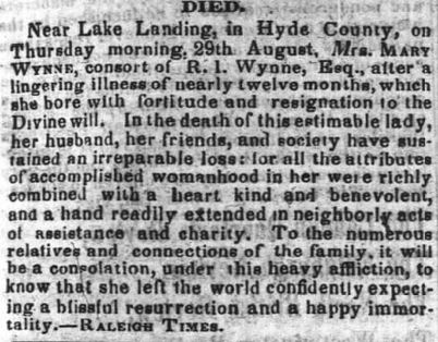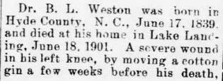 Dr. Samuel WINDLEY died at his home near Lake Landing in Hyde County on November 5th, age 59 years. He leaves a widow and four children. (The Washington Gazette - Thursday, December 5, 1895; pg. 2; column 4) [Posted here with kind permission from John H. Oden, III]
