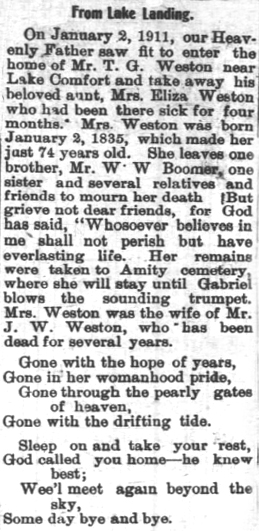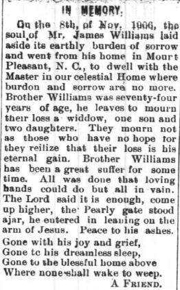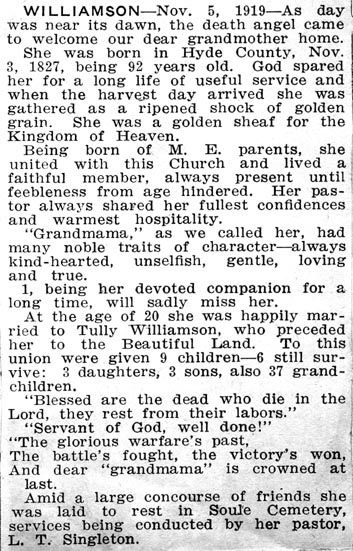After the birth of two children her husband died leaving her to live a widow's life for a few years. She was then married on January 2, 1879 to L.T. Williamson, with whom she lived until her death. He also had two children which she helped to raise to her credit. To this union seven children were born who are all living and mourning the loss of their mother. About the date 1898, she united with the Primitive Baptist church at Goose Creek Island. She lived a faithful member until death, always filling her place and answering to her name unless providentially hindered, also visiting the homes and inquiring after the welfare of the members, and never being any more happy than when talking of the goodness and mercies of the Lord or singing songs in His praise. How she did enjoy to hear Jesus proclaimed from the pulpit and the communion of the Saints! There was never any trouble brought against her in the church. She was a peacemaker, rather than a peace breaker. Her words of counsel were always laden with love and tenderness rather than reproach. To know her was to love her as a Christian. She bore her suffering in a Christian manner, never complaining at, nor doubting the justice of her God, confident He would put no more on her than she was able to bear. She saw much trouble all her days and did much suffering during her last few years on earth. But we were led to believe that all her suffering ended at the grave and that it is now her happy lot to rejoice around the throne of the Lord. "Oh, death, where is thy sting? Oh, grave where is thy victory?"