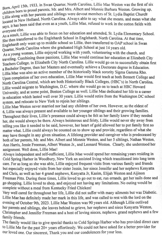 Judy Mann Waits, 80, of Manteo, passed away on Wednesday, August 21, 2024, peacefully at her residence. Ms. Judy was born in Washington, NC on July 17, 1944 to the late Major Joseph A. Waits and Millicent Jennette Waits of Lake Landing, NC. Judy was a graduate of East Carolina University. She was a teacher for a while, as well as worked in radio. Judy Waits is best known for owning Sam & Omie’s Restaurant in Nags Head, NC from 1977 until she retired. Though she retired, she continued to maintain an interest in Sam & Omie’s with her sister, Jakey Waits English, Teresa Merritt, and Carol Sykes. Judy enjoyed surf fishing with the Different Drummers, Sam & Omie’s fishing team, and continued with them in spirit and organization until the end. A graveside service will be held at 10:00 am, on Thursday, August 29, 2024, at St. George’s Episcopal Church Cemetery. The family will visit with friends following the service. She is survived by her dog, Sofee Marie, a brother, Bill Waits of Engelhard, her niece, Bonnie Jo Waits of Wanchese, great-niece, Stormy Heroux, and great-great nephews, Wyatt and Gauge Cooper, her step-niece, Charlene Mann and many beloved cousins and close friends. In addition to her parents, she was preceded in death by two sisters, Jakey Waits English, and Bonnie Jo Waits. Arrangements are by Bryan Funeral Service, Swan Quarter. (Bryan Funeral Home)WAITS, Millicent Jennette
