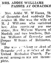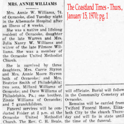 SUFFOLK, VA. - Wilma Austin WILLIAMS, 81, of Canterbury Crest Lane, Suffolk, Va., died July 15, at her residence. Mrs. Williams was a native of Corolla, resident of Ocracoke most of her life, and a homemaker. She was the daughter of the late Wesley and Mrs. Isabell Barnett Austin and the widow of Pinta David Williams. She is survived by one daughter: Alice W. Clark of Suffolk; one sister: Ruby Garrish of Ocracoke; three grandchildren and three great-grandchildren. A church service will be held Tuesday, July 17, at 1 p.m. in the Ocracoke United Methodist Church by the Rev. Clyde Denny. Burial will follow in the Williams family cemetery. Twiford's Island Chapel, Hatteras, is in charge of arrangements. The family suggests contributions may be made to the Ocracoke United Methodist Church. (The Coastland Times - 1990)