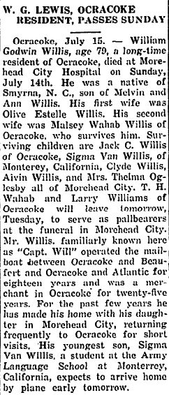 OCRACOKE - Sigma Van WILLIS, 69, died Tuesday, May 21 in the Albemarle Hospital. He was born in Hyde County, son of the late Will Godwin and Malsey Wahab Willis. He retired from the U.S. Army and was a magistrate with Hyde County. He is survived by two nephews: Jack C. Willis, Jr. of Ocracoke and Jay Dee Willis of Wedgefield, S.C.; two great-nieces: Hailey Willis and Lynne Lacy; a great-great-niece, Jessica Lacy; and a great-great-nephew. Joshua Lacy. Memorial service will be conducted Saturday, June 1 at 2 p.m. in the Ocracoke United Methodist Church. Twiford's Memorial Chapel, Elizabeth City, is in charge of arrangements. (The Coastland Times - Thursday, May 23, 2002; pg. 6A)