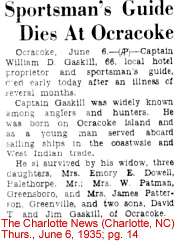 William D. "Captain Bill" Gaskill was born on May 30, 1869 at Ocracoke, Hyde County, N.C., the son of Benjamin Decatur Gaskill, Sr. (1837-1881) & Sarah E. Owens (1840-1915). He married on March 10, 1897 to Annie Belle Fulcher (1879-1941) of Ocracoke, daughter of Josephus Fulcher, Jr. (1838-1883) & Mary Ann Williams (1845-1911). Captain Bill and Annie were the owners and operators of the Pamlico Inn there. After having an operation at St, Leo's Hospital in Greensboro, NC in March, Capt. Bill died at home on June 6, 1935 of complications [see obituary and death certificate]. They are buried in the Fulcher-Gaskill Cemetery on Ocracoke, near the Lighthouse. Their children were: David L. Gaskill, Mary Elizabeth Gaskill, Tony Thurston Gaskill, Earl Gaskill (female), Lillian Carson Gaskill, William David Gaskill, Nellie H. Gaskill, and James Baughm Gaskill.