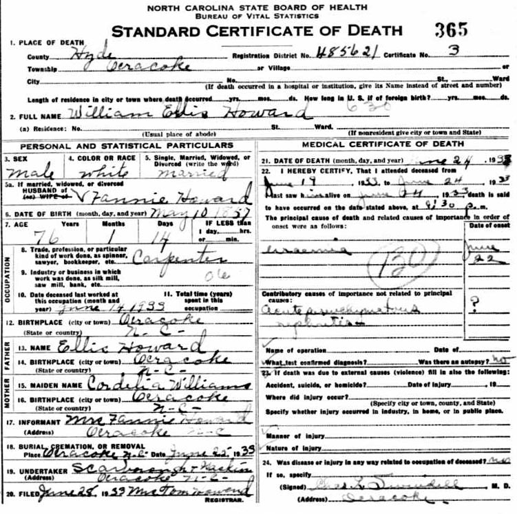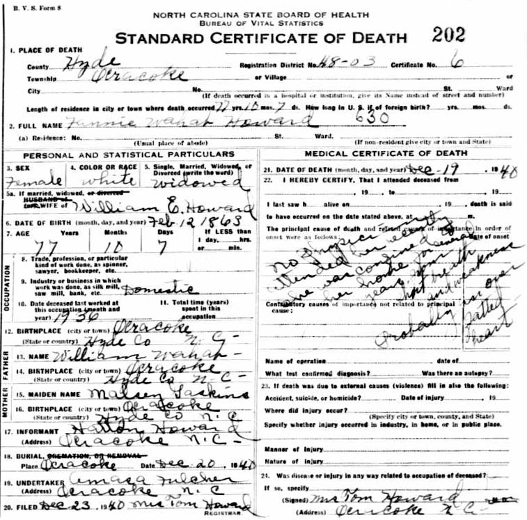 A story extracted from Ocracoke Island Journal: An Occasional Journal of Daily Island Life published by Phillip Howard on Friday, March 25, 2011 states that William's father was the island lighthouse keeper. William died in 1933 and Fannie died seven years later. During that interval she kept her casket in the parlor, propped up on two straight-backed chairs. |