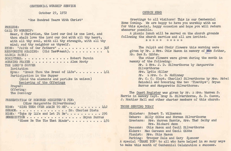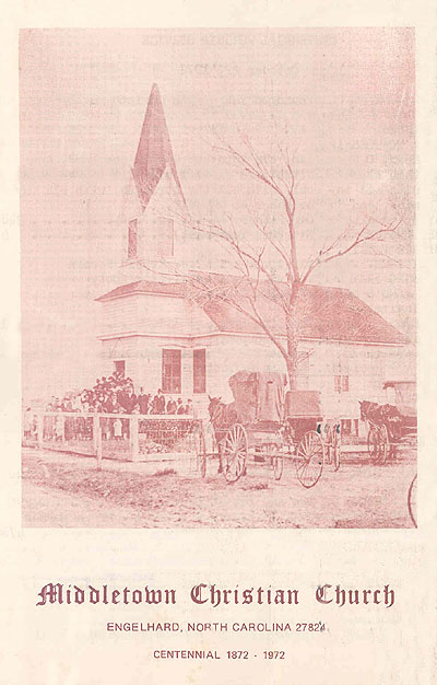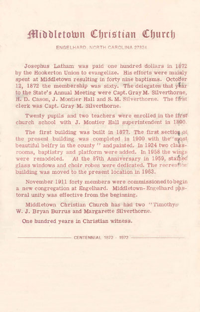 The church celebrated its Centennial during October, 1972, with special emphasis each week with the Engelhard congregation joining in the activities. The theme, "One Hundred Years in Christian Witness" gave opportunity to review the church history and doctrine, for the older members in mid-week luncheons to "Remember When", for the two "Timothys", W.J. Bryan Burrus and Margarette Silverthorne, to participate in one service, for a special menu for the annual bazaar and for a special local membership luncheon. The Centennial Homecoming Day, October 29, 1972, found the church packed to capacity and overflowing with all three of the N.C. Christian Church ministers in attendance. Dr. Charles Dietze, executive minister, brought the message. Alex Mooty, associate minister and former ministerial colleague, presented Miss Silverthorne with the honored minister's pin, given by Christian Church Pension Fund to retired ministers. Lunch and fellowship on the grounds followed, climaxing the Centennial program. In 1974 the baptistry was repaired, and wall-to-wall carpeting and new drapes were installed. At the present time with declining population in Middletown, the active membership is less than 100 but regular weekly Sunday School and twice a month worship services are held. (Information taken from Hyde County History published by the Hyde Co. Historical Society in 1976.)