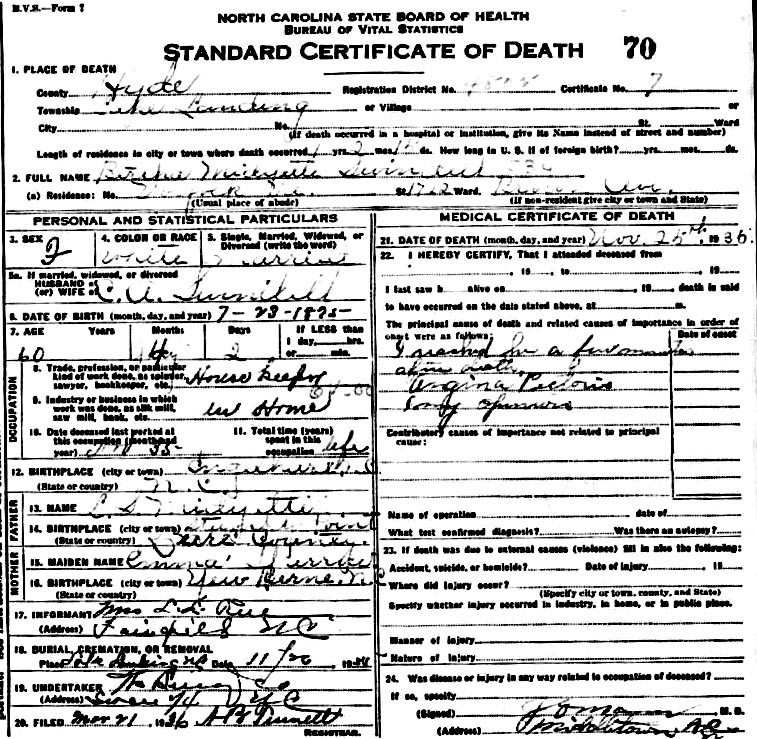 Bertha Midyett was the daughter of Little Samuel Midyett, Sr. (1825-1882) and his 2nd wife, Emma Sparrow (1842-1881). Bertha was born July 24, 1874 and died November 25, 1935 [see death certificate]. Bertha married Charles Adams Swindell (1871-1950) in Hyde County on November 22, 1893 and to them was born one son, James Morgan Swindell (1895-1937). After Bertha's death in 1935, Charles A. Swindell married Ruby Cox Wells of Faceville, Georgia on November 9, 1936 and then married for the 3rd time to Martha Matilda Adams on September 16, 1940.
