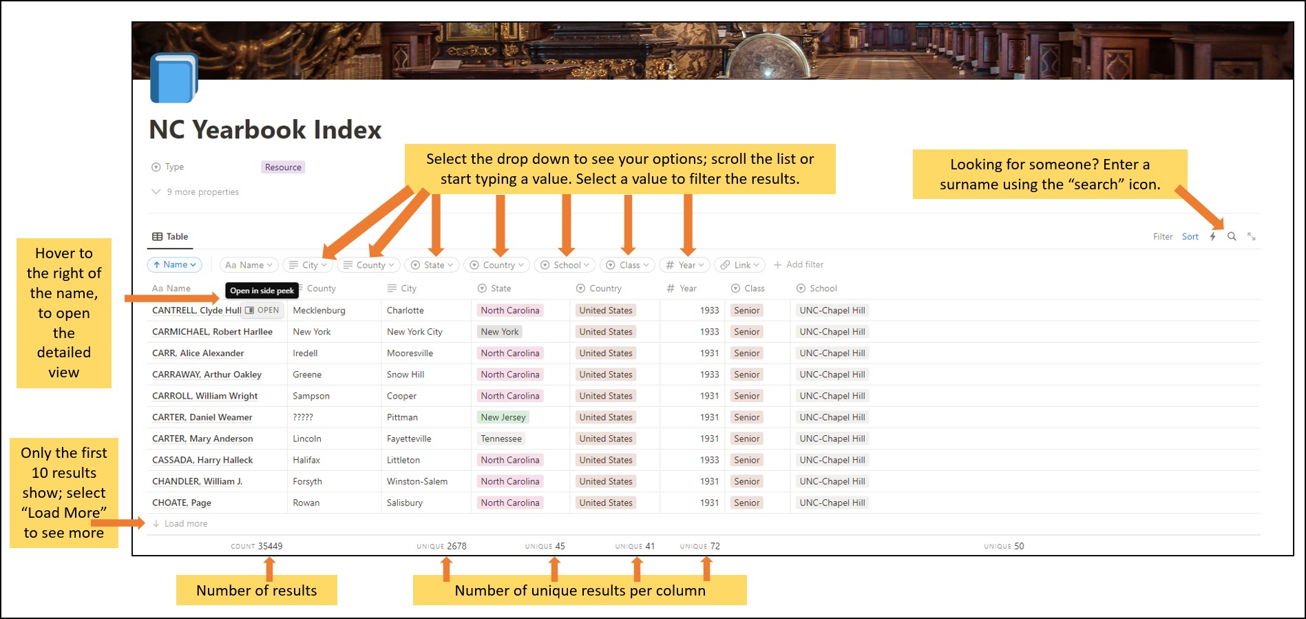 About the database:  The NC Yearbook database was created by Taneya Koonce, Assistant State Coordinator of the NCGenWeb Project. The database is hosted using Notion.  Most entries in the database are collected from yearbooks digitized and hosted online by DigitalNC.