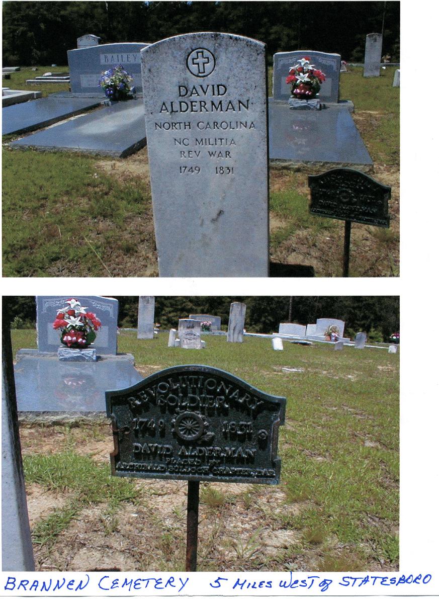 | Alderman, David | NC Militia | Brannen Cemetery | Statesboro, Bulloch Co., Georgia |