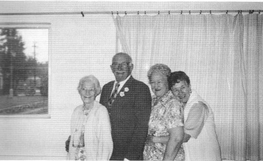 ABOVE: Left, Henry Bascomb Sledge (1860-1925), the son of Julia Ann Holloway and Francis Marion Sledge (1811-1900). He was the grandson of Zelpha Harris (d125/712) and Collin Sledge. Center and right, Buster Earl Sledge, Sr. (1891-1962), son of Isabel Watts Purcell and Henry Bascomb Sledge, with his wife, Katie L. Lummus. These last two pictures were taken in 1929 at their home in Oakland, California. BELOW: This photo, of April 17, 1993, shows the four living children of Katie L. Lummus and Buster Earl Sledge, Sr. (d125/7121/C1). Left to right, Sybil Sledge McKenty, Buster Earl Sledge, Jr., Kathryn Sledge Nordell and Zelda Sledge Cleveland. |