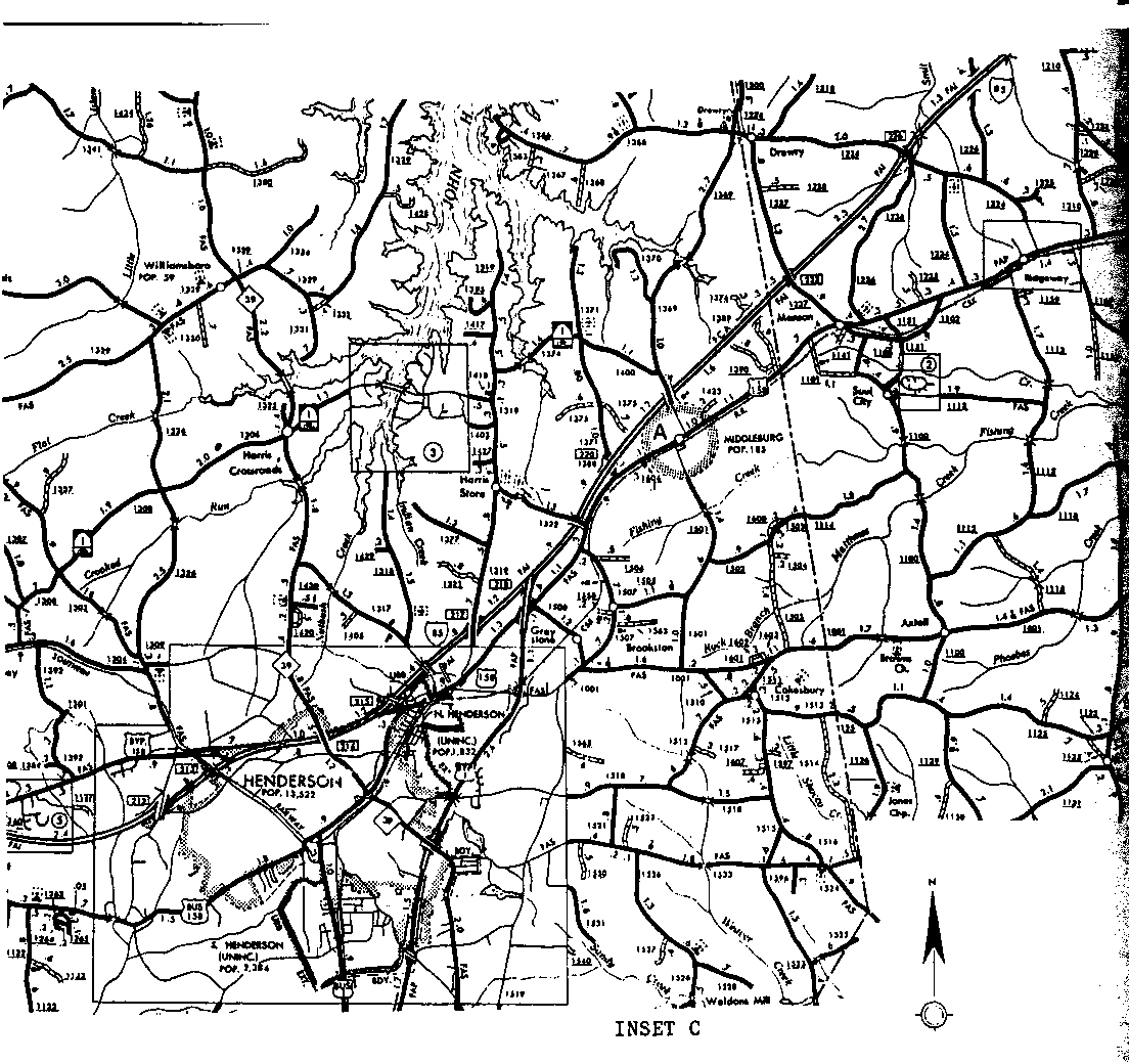 INSET C The above exhibit shows a portion of Vance County on the left and Warren County on the right. These are portions of County maps produced by the State of North Carolina. There were early settlements of Harris families throughout this area. A. Some remnants of the home of Isham Harris (1741-1816), a grandson of Edward Harris (d121), still remain on the west side of I-85 near Middleburg. Also, in Middleburg on U. S. Highway 1, the home of Britian Harris, the son of Isham Harris, is still in use as a residence. Isham Harris (d121/71) was the grandfather of Isham Green Harris, Governor of Tennessee and United States Senator. |