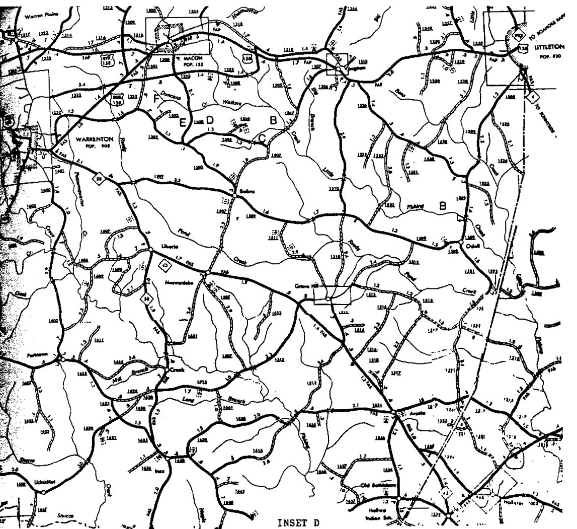 The exhibit on this page is a portion of an official Transportation Map produced by the State of North Carolina. The migrations of this Harris family from the Virginia Colony to the northeastern areas of North Carolina began about 1740. The initial settlements were in the counties of Edgecombe, Granville, Halifax and Bute (which is now Warren and Franklin). Insets C and D are shown on the following pages. |