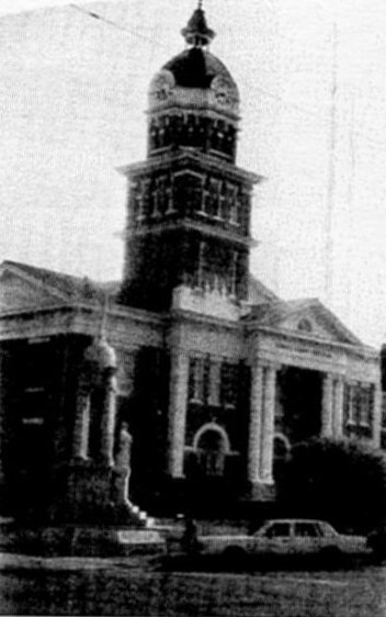 These are scenes of Columbus, Mississippi. Upper left is a view of Friendship Cemetery, where many of the Harris family relatives are buried. Upper right is a view of the Tombigbee River from the bluff. Lower right is a view of the Lowndes County Courthouse. Lower left is a view of the residence, located at 607 Third Street South, which was the home of James Walton Harris (d121/61B1). James was born in 1805 in Elbert County, Georgia and died in 1887 in Columbus . This beautiful home, called Whitehall, was built in 1843. (Photos May 30, 1991 by R. E. Harris.) |