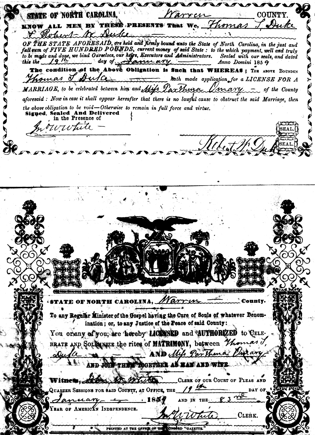 Omary Parthena Duke Thomas S 19 Jan 1859   Robert W. Duke White