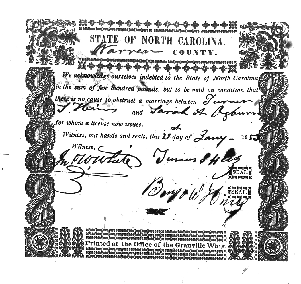 Ogburn Sarah A Hines Turner S 21 Jan 1853   Benjamin W. King White