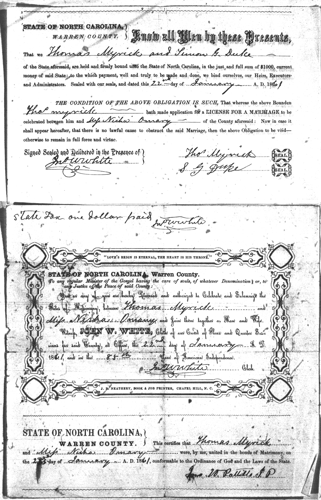 Omary  Nisha Myrick  Thomas 22 Jan 1861   Simon G. Duke White