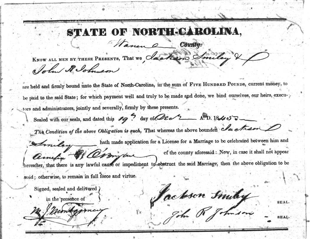 Obryan  Amelia G Smiley  Jackson 19 Dec 1845   John R. Johnson White