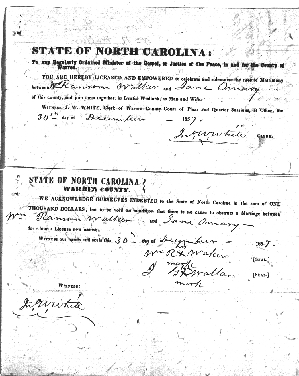 Omary  Jane Walker  William Ransom 30 Dec 1857 30 Dec 1857 John W. White White