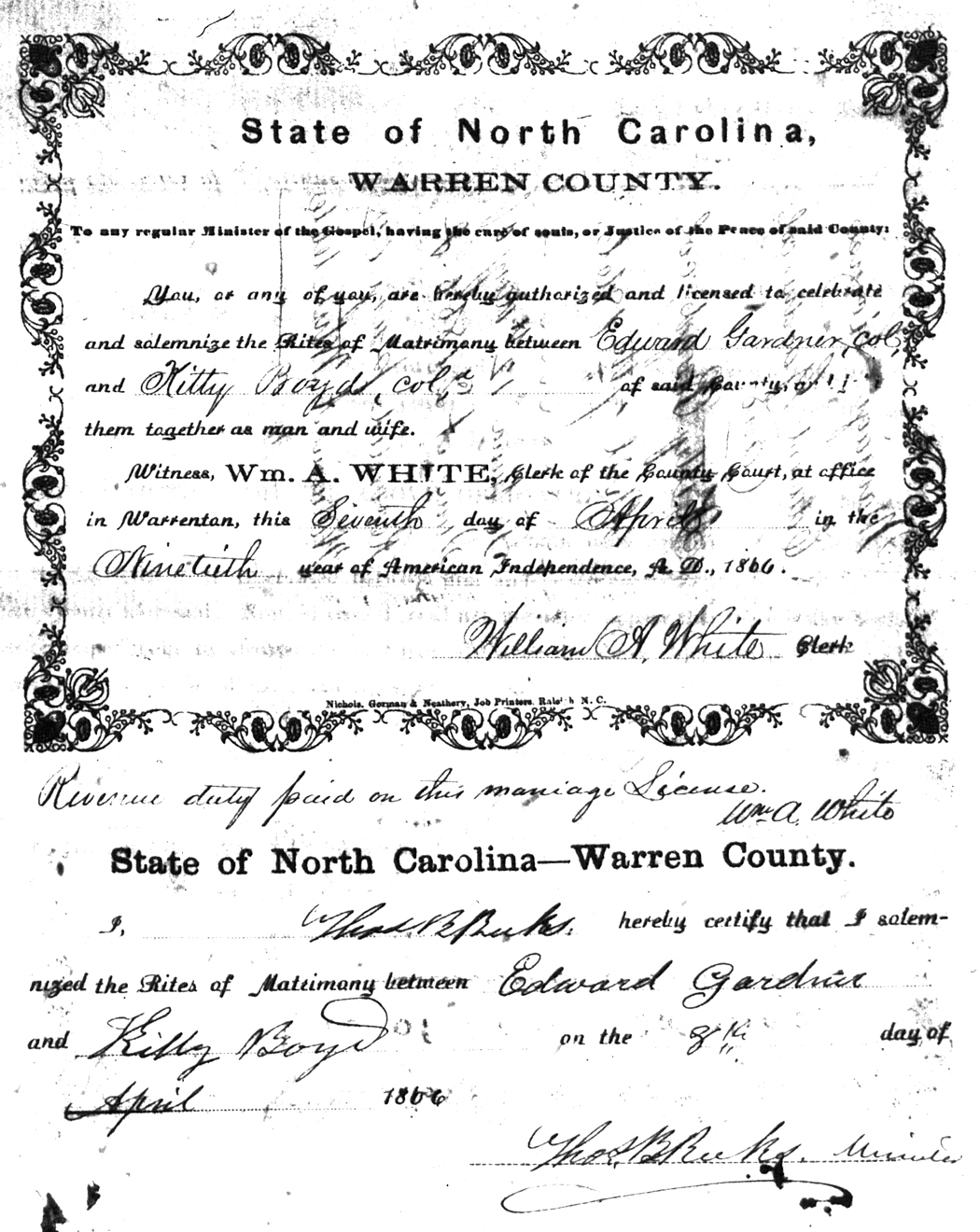 Gardener Edward Boyd Kitty 07 Apr 1866 07 Apr 1866 Alfred Davis Colored
