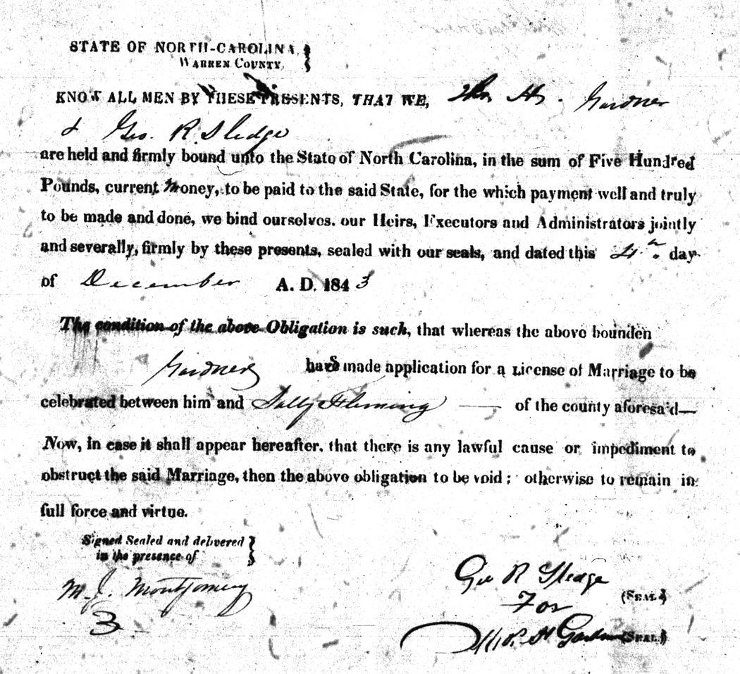 Gardner Thomas H Fleming Sally  04 Dec 1843   George R. Sledge White