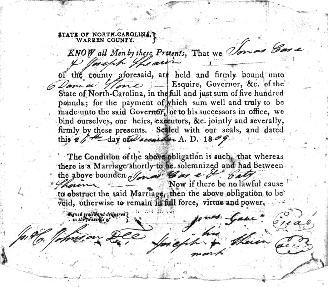 Gasee Jonas Sherin Caty 26 Dec 1809   Joseph Shearin White