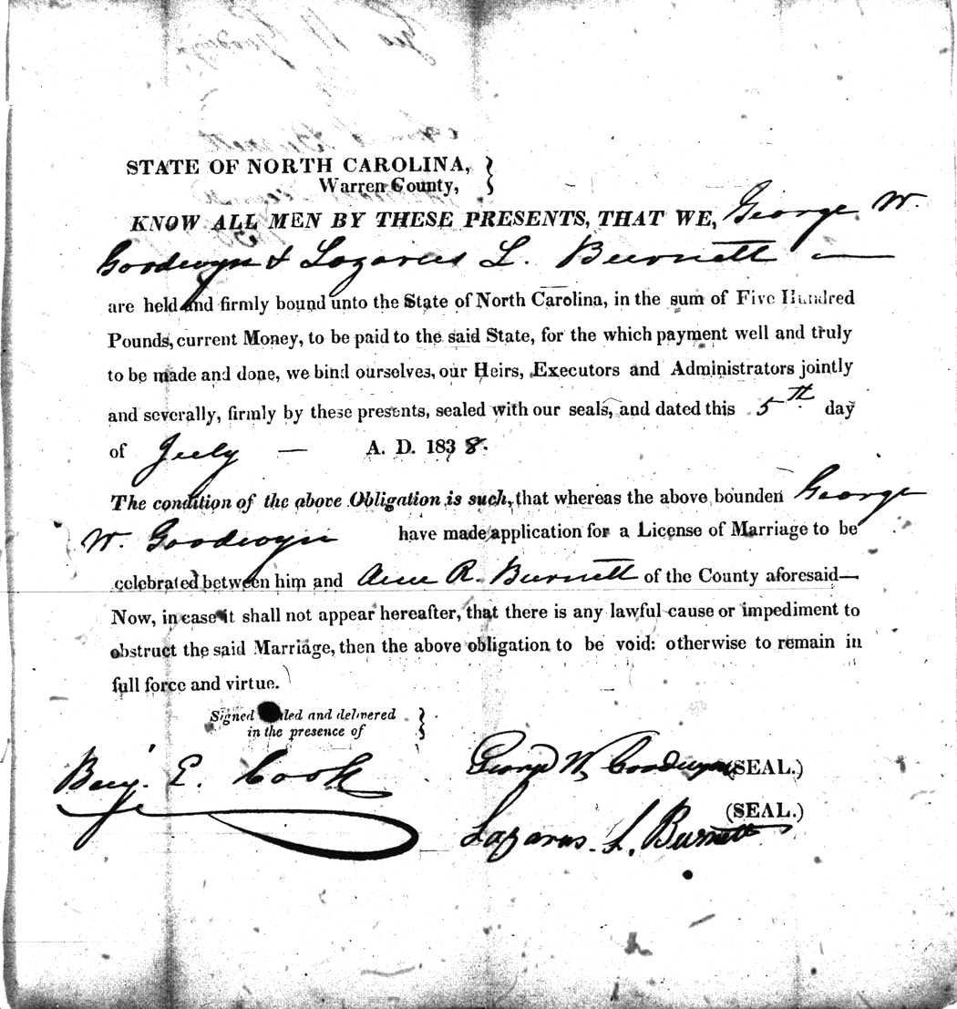Goodwyn George W Burnett Ann R 05 Jul 1838   Lazarius Burnett White