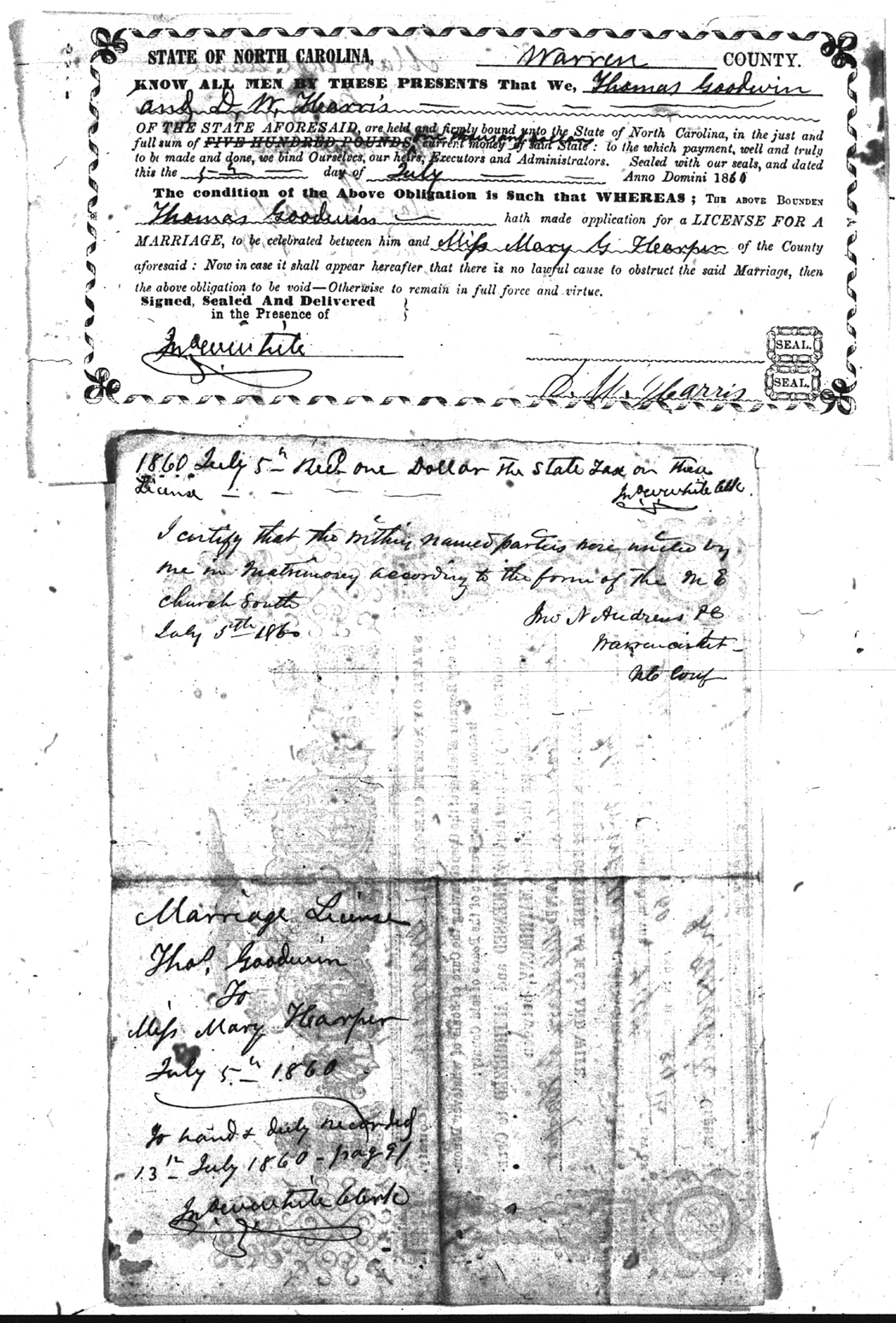 Goodwin Thomas  Harper Mary G 05 Jul 1860   D. W. Harris White