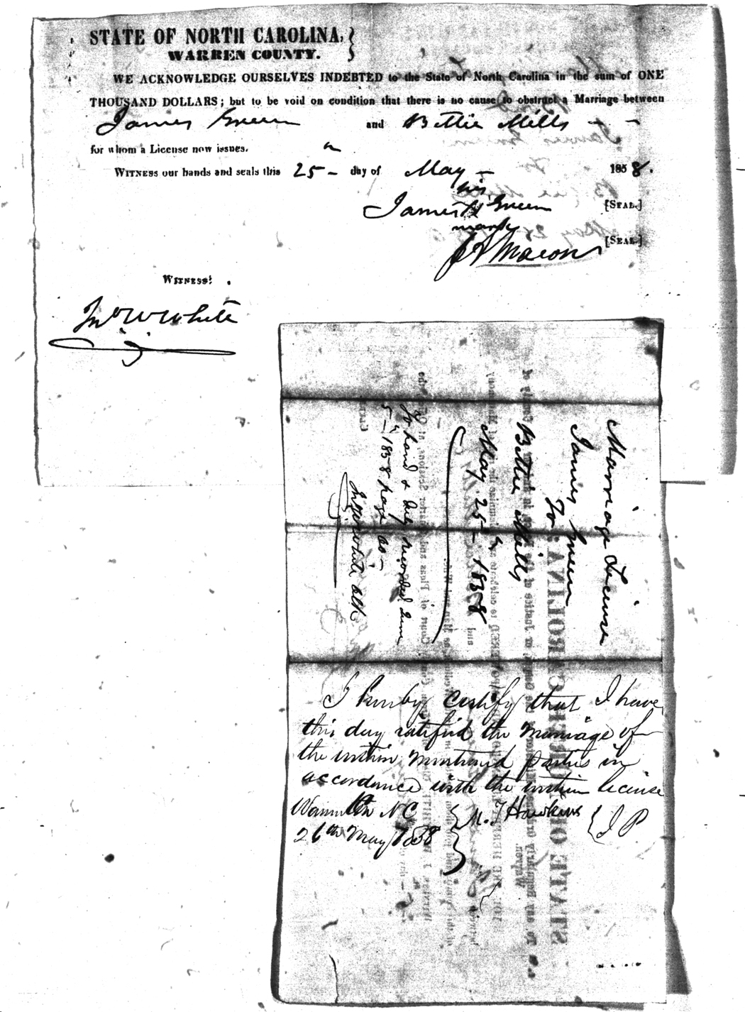 Green James Mills Bettie 25 May 1858 25 May 1858 M. T. Hawkins Colored