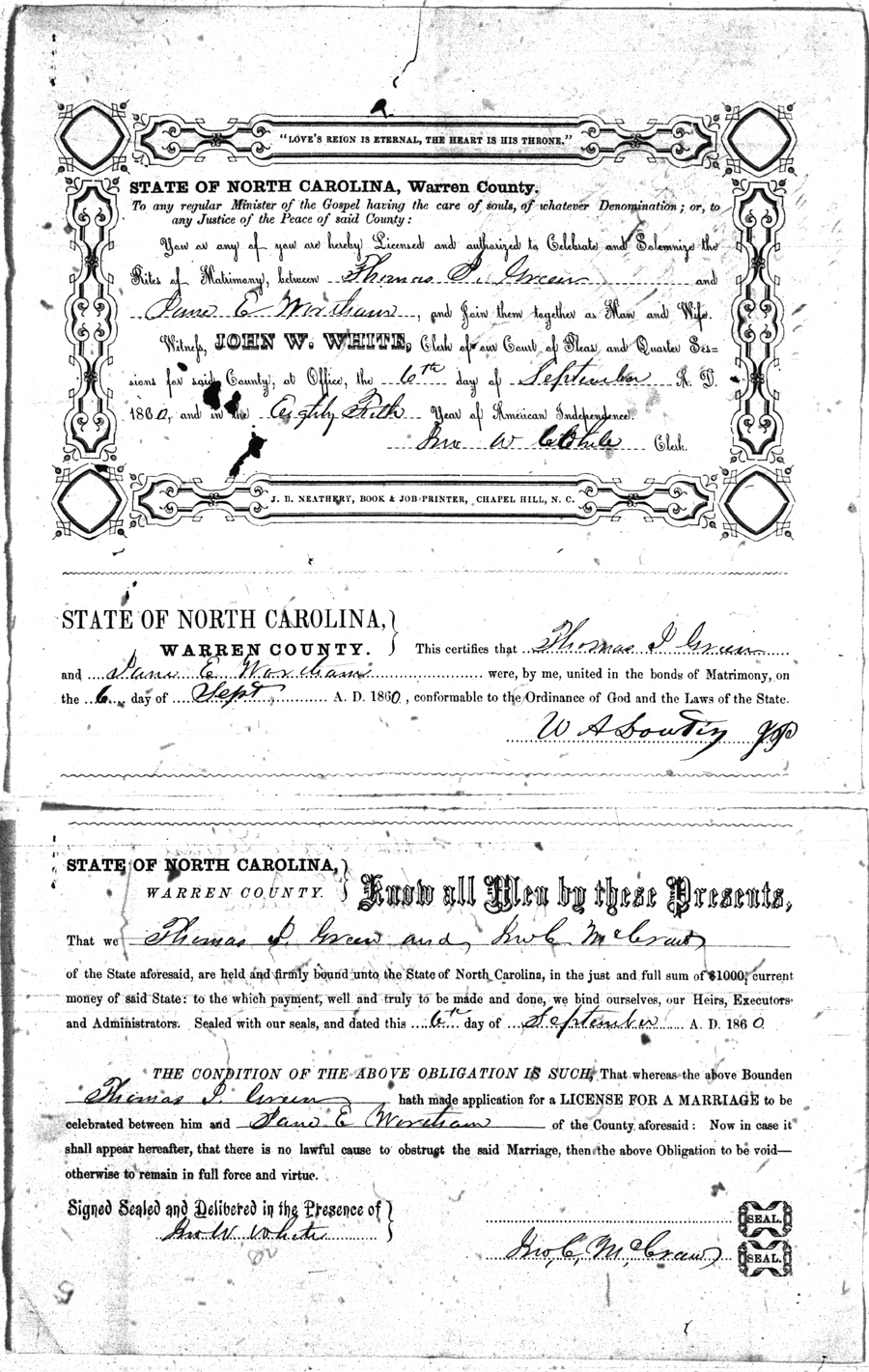 Green Thomas J Wortham Jane E 06 Sep 1860   John C. McGraw White